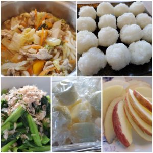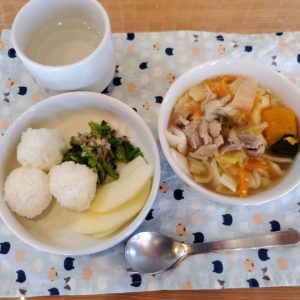 【後期】☆あったか味噌煮込みうどん☆ころころおにぎり☆小松菜のお浸し☆りんご
