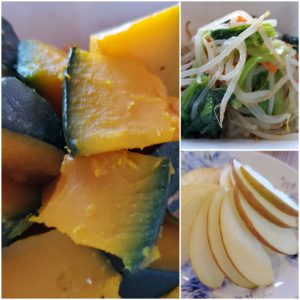 ☆蒸かし南瓜☆小松菜ともやしのナムル☆りんご