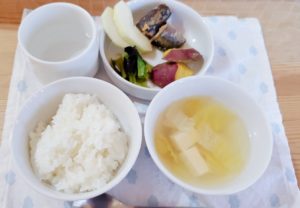 【完了期】☆白米☆白菜と豆腐のスープ☆鯖の味噌煮☆蒸かしさつま芋☆小松菜の海苔和え☆りんご