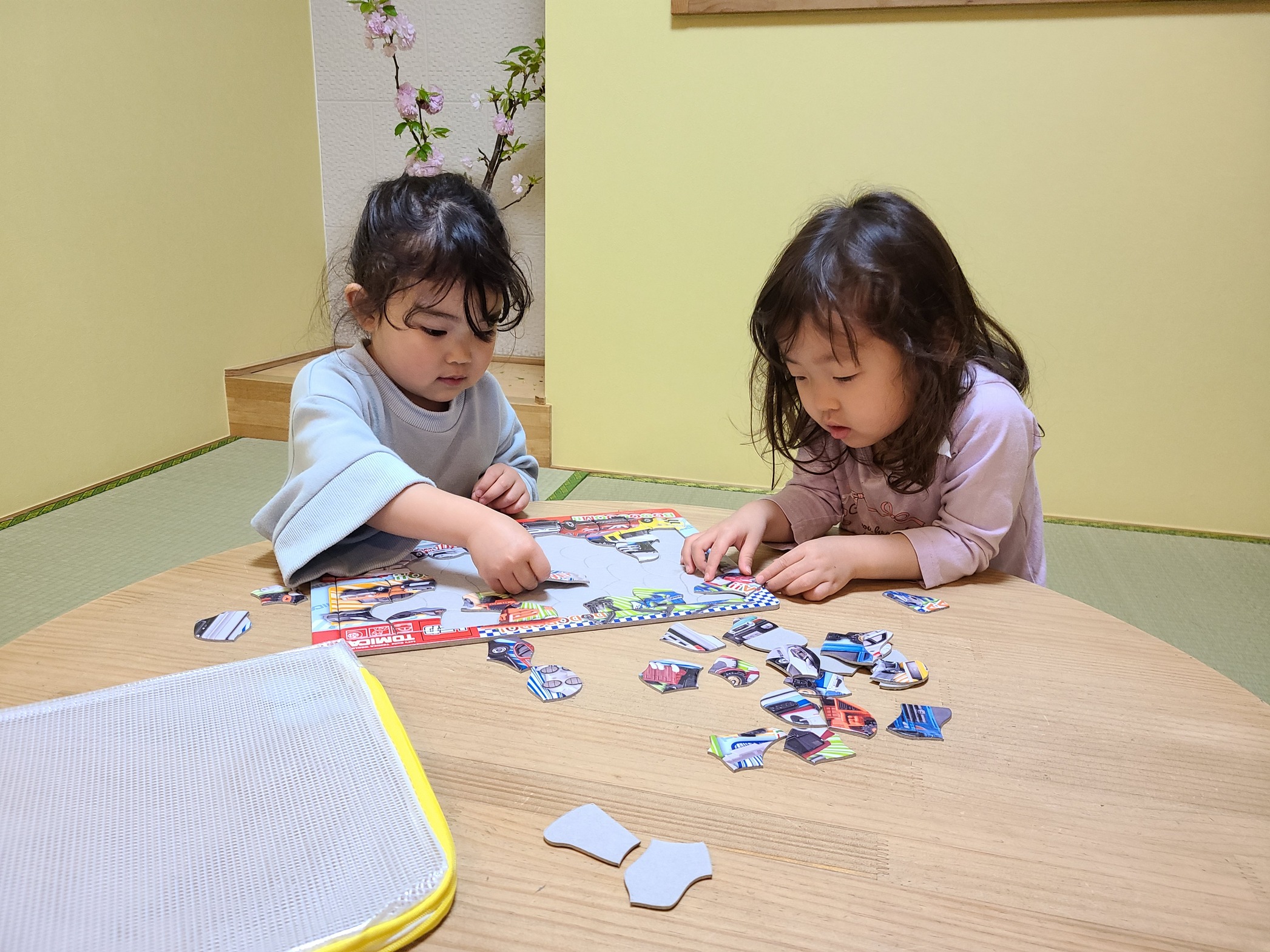 「きょうは、おむかえくるまでパズルしてまってる!!」と決めた女の子はお友達とパズルに熱中していました。アトリエではそれぞれが考え遊びこんでいました。