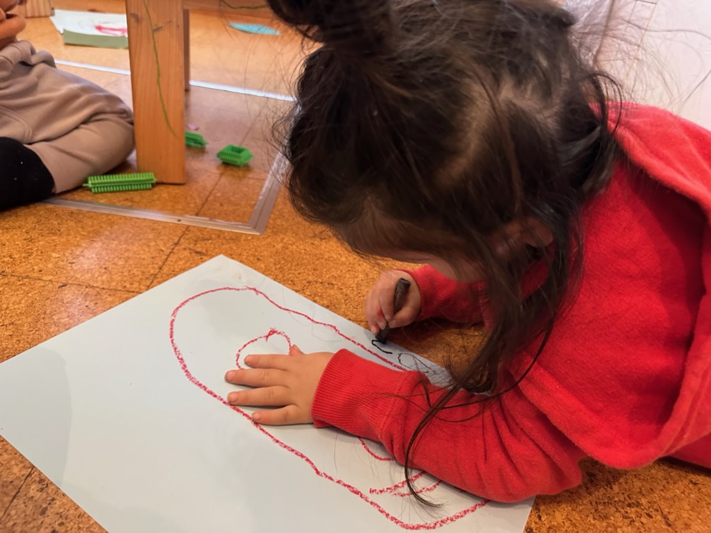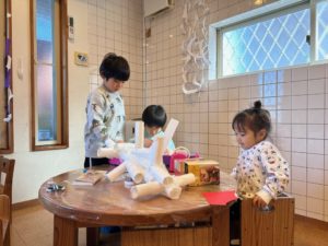 アトリエ室ではクレヨンを使って絵を描いたり、製作をしたり….
