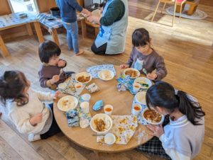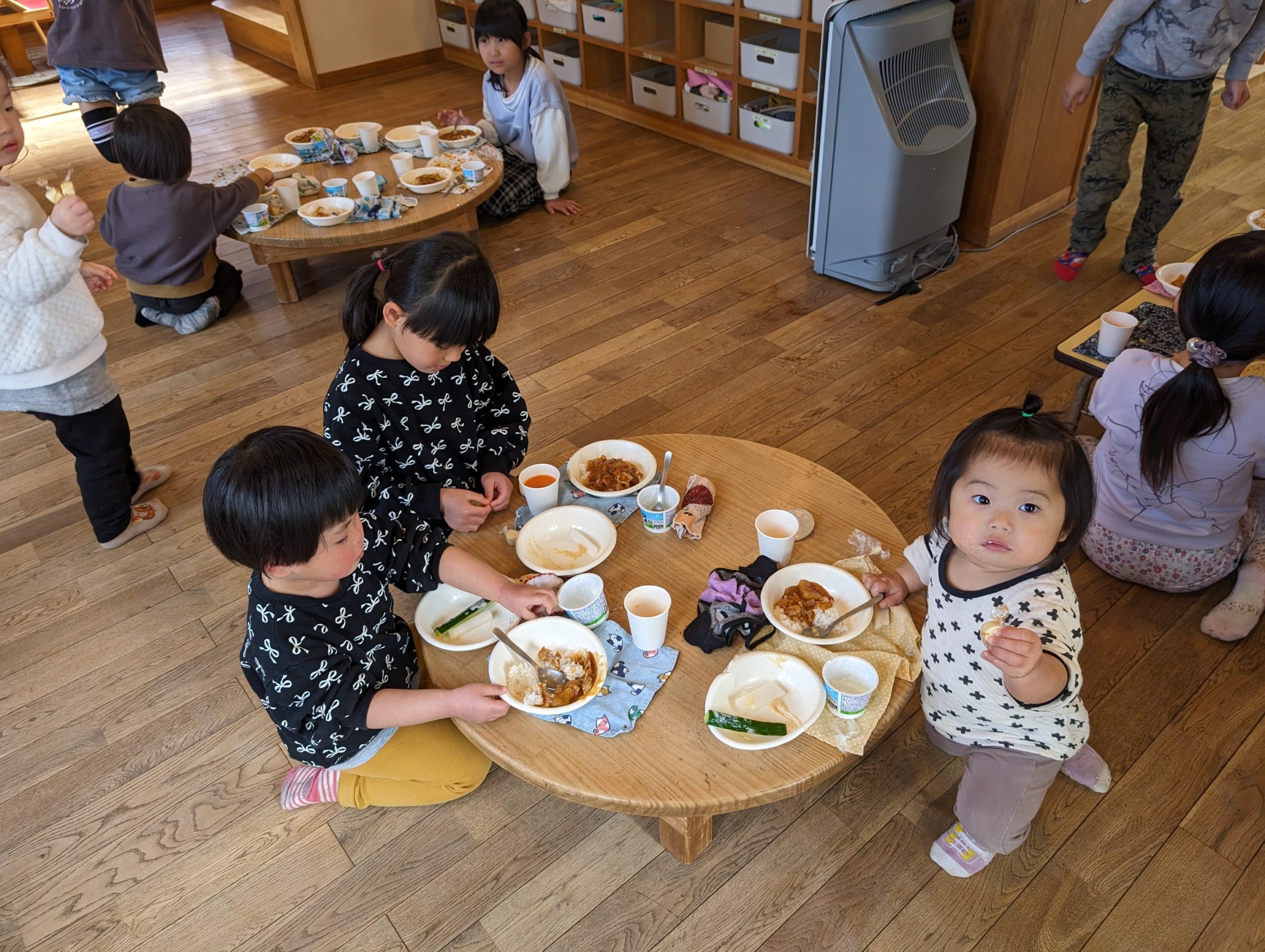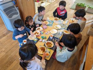 お部屋で遊んでいるとランチルームからいい匂いがしてきました~😊「いい匂い~お腹空いた~!!」と子ども達からのリクエストもあり早めにランチをとることに!!