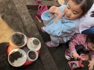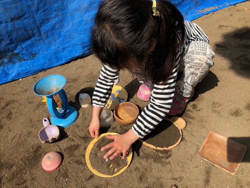 お庭では砂の感触を楽しみながらそれぞれがイメージを膨らませて遊んでいます(^^♪