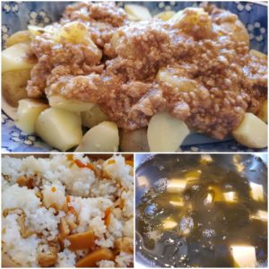 ☆筍ご飯☆わかめと豆腐の澄まし汁☆新じゃが芋のそぼろあんかけ